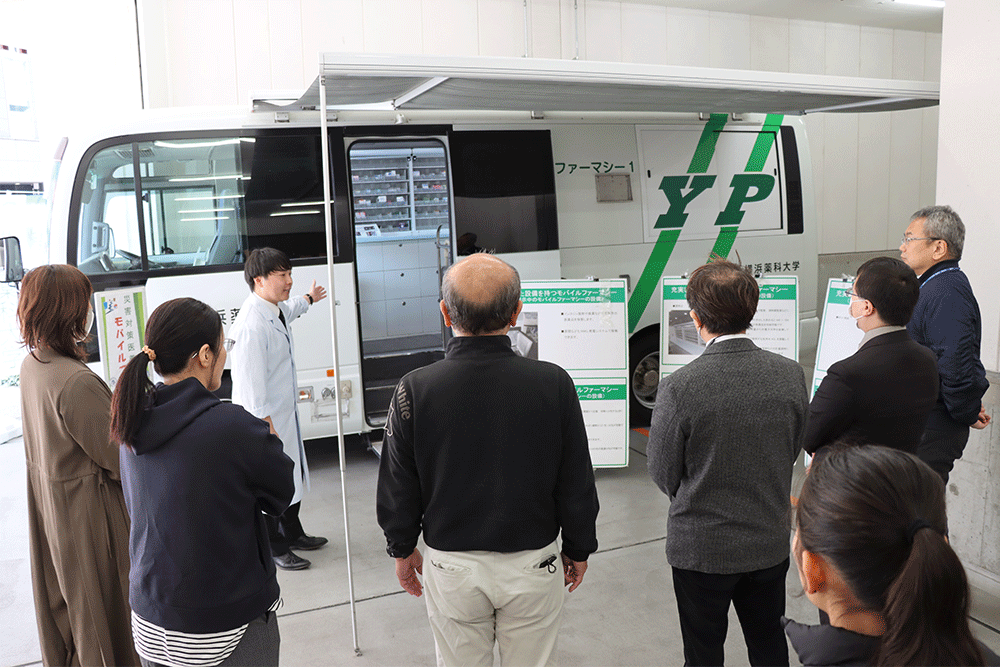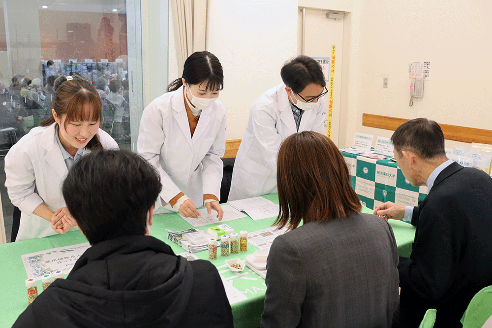また、漢方薬学科を設置する本学の特長を活かして「薬用植物系入浴剤を作ってみよう」の体験ブースを開設し、あわせて被災地などで移動薬局としての機能を果たすモバイルファーマシー1号車の展示を行い、多くの皆さんに参加、見学をしていただきました。