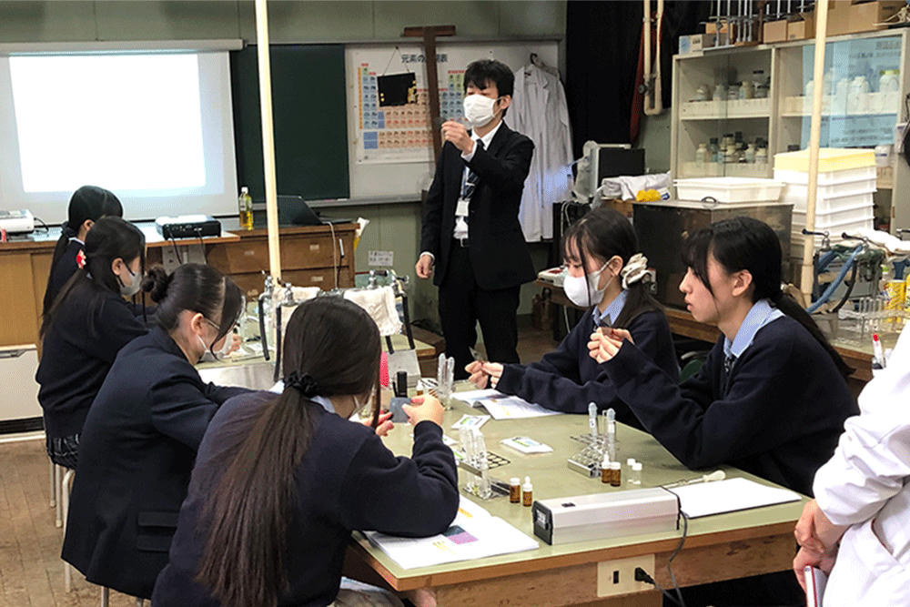 11月4日(火)緑ヶ丘女子高等学校にて、理系コースの生徒を対象に天然有機化学研究室の鰐渕清史准教授が「光の化学~ケミカルライトを体験しよう~」についての講義および体験授業を行いました。参加した生徒さんは積極的で、楽しく取り組んでいたのが印象的でした。