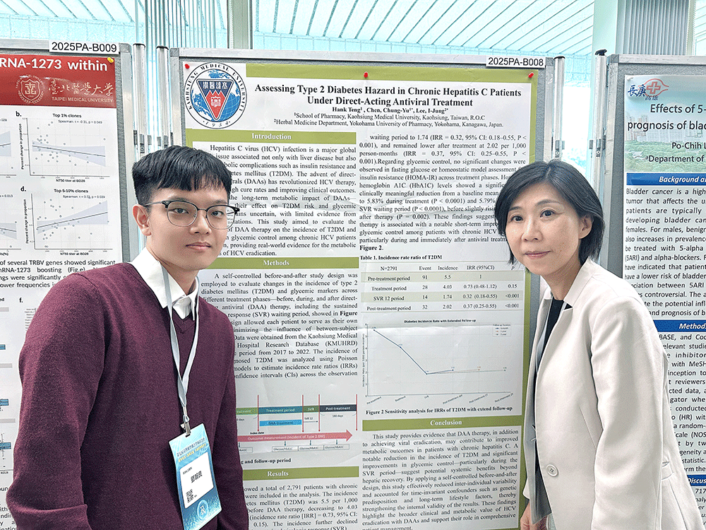 薬用資源学研究室の李宜融(り いゆう)教授は、11月23日に台湾で開催された「2025第7回台湾薬学連合学術シンポジウム(2025 The 7nd Taiwan Joint Conference of Pharmacy and Pharmaceutical Sciences)」において、本学のMOU締結校である高雄医学大学との共同研究に基づき、「Assessing Type 2 Diabetes Hazard in Chronic Hepatitis C Patients Under Direct-Acting Antiviral Treatment.」の演題でポスター発表しました。本シンポジウムには世界各地から多数の薬学関係者が参加し、薬学研究の成果および最新動向に関する高度な議論が交わされました。