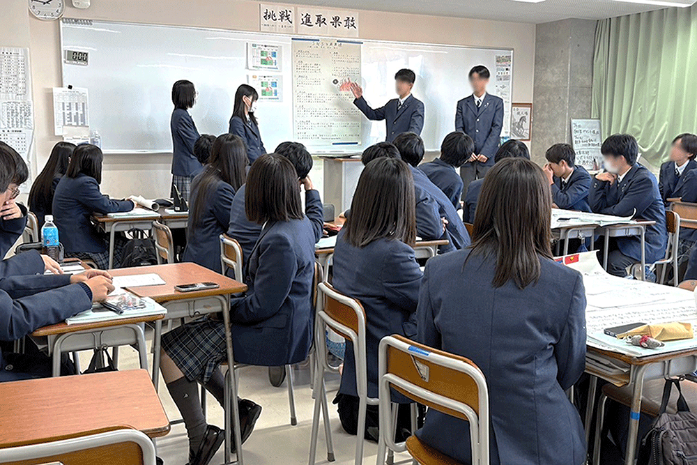 生徒たちが主体的に調査・考察を重ねながら探究活動に取り組んだテーマを、グループごとにポスターやパワーポイント等異なる方法で、探究成果の発表を行いました。各グループがそれぞれの課題解決策を丁寧にまとめ発表する姿がとても印象的でした。