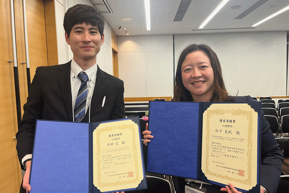 第46回日本臨床薬理学会学術総会 (2025年12月5−6日・東京) において、本学薬学部および大学院卒業生(現在本学共同研究員)の松下 友紀さん(指導教官 千葉 康司教授)と中村 亮 博士(指導教官 吉門 崇准教授・千葉 康司教授)のお二人が優秀演題賞(口演部門)を受賞しました。