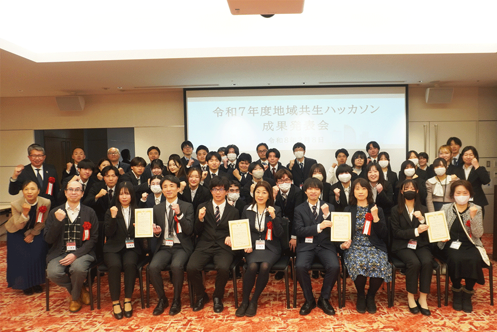 地域共生ハッカソンは、AIやICTなどのテクノロジーを活用して地域課題を解決する手法を開発するコンテストで、様々な学校の混成チームが5ヶ月間でアイディア創出からフィールド調査、製作活動を行いました。
