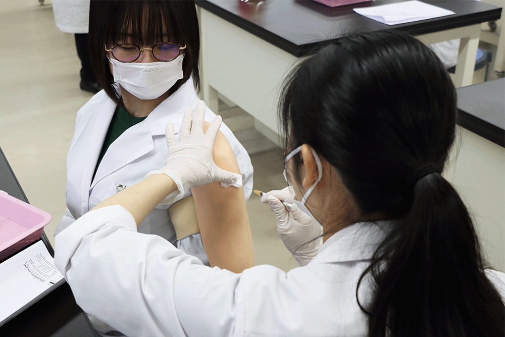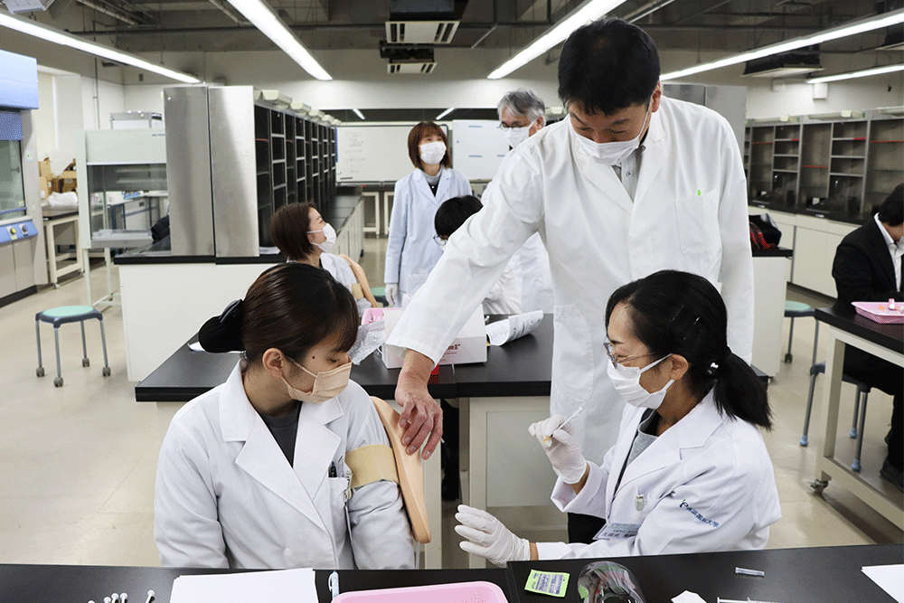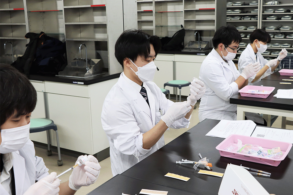 コロナ禍において薬剤師をワクチン接種の担い手とする議論が行われましたが、将来薬剤師がワクチン接種を担うことになると想定し、令和8(2026)年2月14日(土)に、臨床薬学科専攻科目以外の学科独自の取り組みとして『臨床薬学科特別プログラム「筋肉内注射によるワクチン接種の手技を身につける」』を実施しました。
