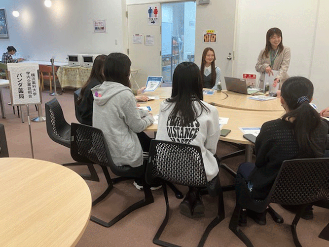 本学の食堂において「パンダ薬局(4月15日)」「岩井化学薬品株式会社(4月27日)」の担当者様による学内企業説明会を開催しました。